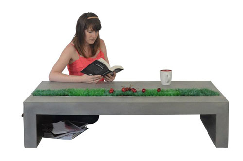 Une table basse design pour accompagner votre canapé ? 1Si vous n’avez peur de rien et surtout pas du mobilier avant-gardiste, peut-être oserez-vous une table basse en béton ? Surtout que celles proposées par Rendez Vous Déco se permettent toutes les excentricités. La table basse Green et son petit coin de verdure personnalisable en est le parfait exemple. Sables, plantes, fleurs, bougies, mettez-y ce que vous voulez !